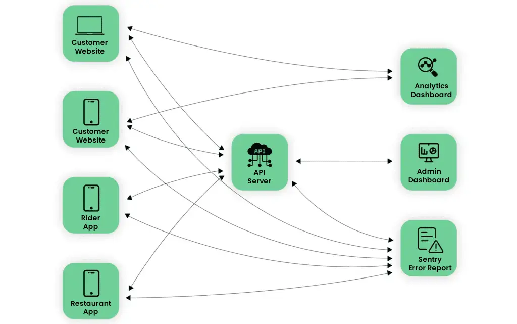 - Sentry receives error submissions from the customer, restaurant, rider, and web customer apps and API servers.
